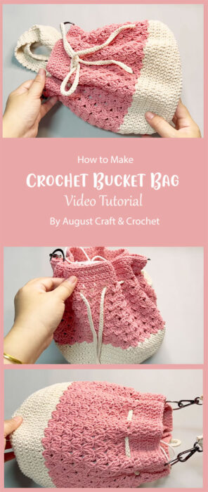 This vibrant two-tone bucket bag pairs a creamy base with a beautiful textured pink upper section, giving it a fresh and playful style. The beautiful stitches on the pink portion add depth and charm, while the smooth stitches on the base provide structure and balance. Finished with a simple drawstring closure and sturdy metal strap hooks, it’s both fashionable and functional. August Craft & Crochet’s video tutorial guides you through every step, making it a delightful project for adding color and texture to your handmade accessories.