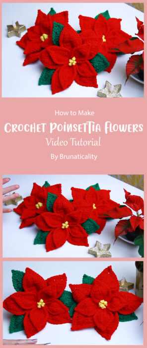 These crochet poinsettia flowers by Brunaticality capture the beauty of the holiday season in a bold and festive way. The layered red petals paired with bright yellow centers and deep green leaves make them stand out as a stunning Christmas decoration. Perfect for adding to wreaths, table centerpieces, or even as a statement piece on their own, this video tutorial guides you through each step so you can create flowers that look both elegant and joyful. With their realistic shape and vibrant color combination, these poinsettias bring instant holiday warmth to any project.